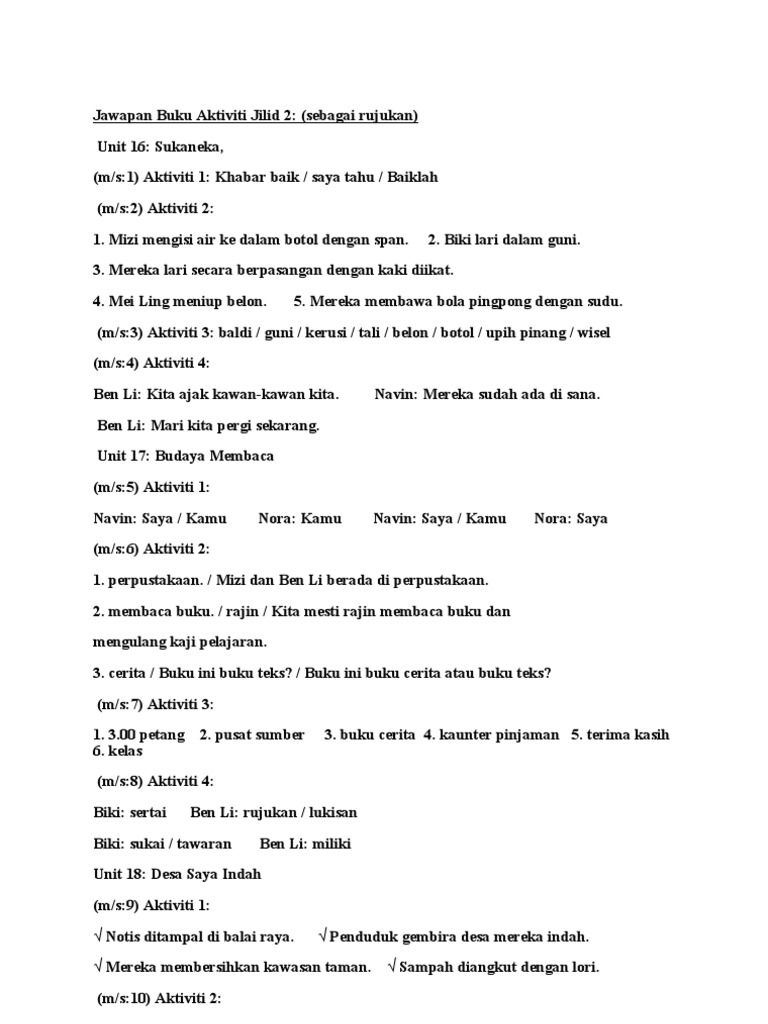 BAHASA MALAYSIA TAHUN 1 Jawapan Buku Aktiviti Jilid 2. Jawapan Unit 16-19 ms 1-18doc. Jawapan bm ti jilid 2.